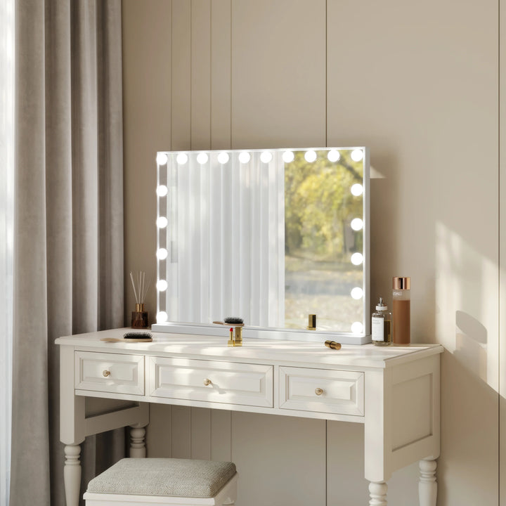 Enhance your daily makeup routine with this elegant Hollywood-style vanity mirror. Its clean lines and sophisticated white finish add a touch of class to any room. The large rectangular design (80cm W x 62.5cm H) provides a clear, spacious reflection, perfect for precise makeup application and styling. With adjustable color temperature and brightness, the LED bulbs emit soft, natural light that is gentle on your eyes, ensuring you always have the perfect lighting for any occasion.