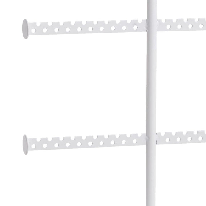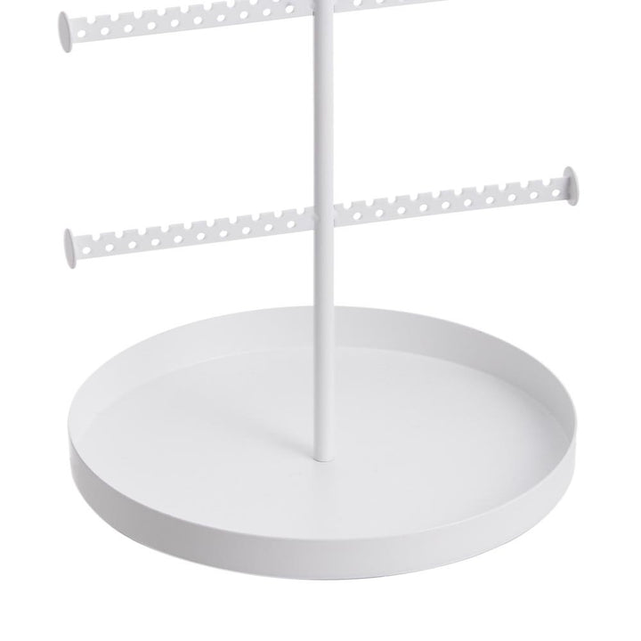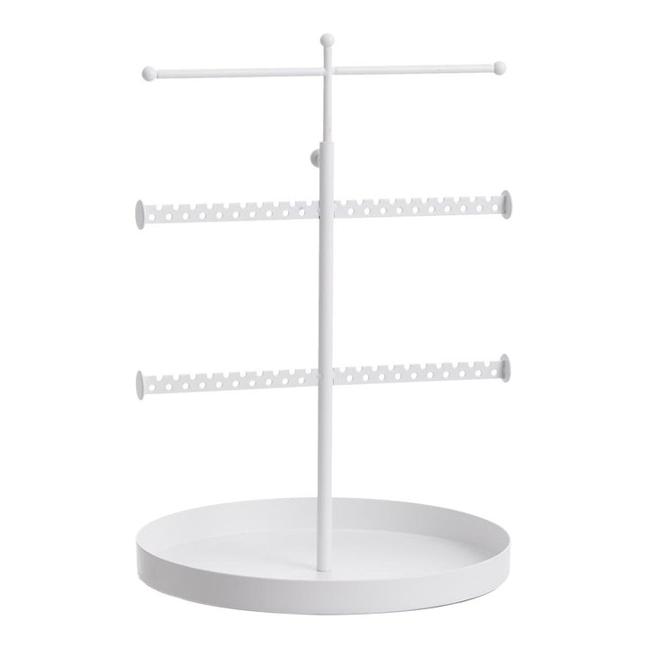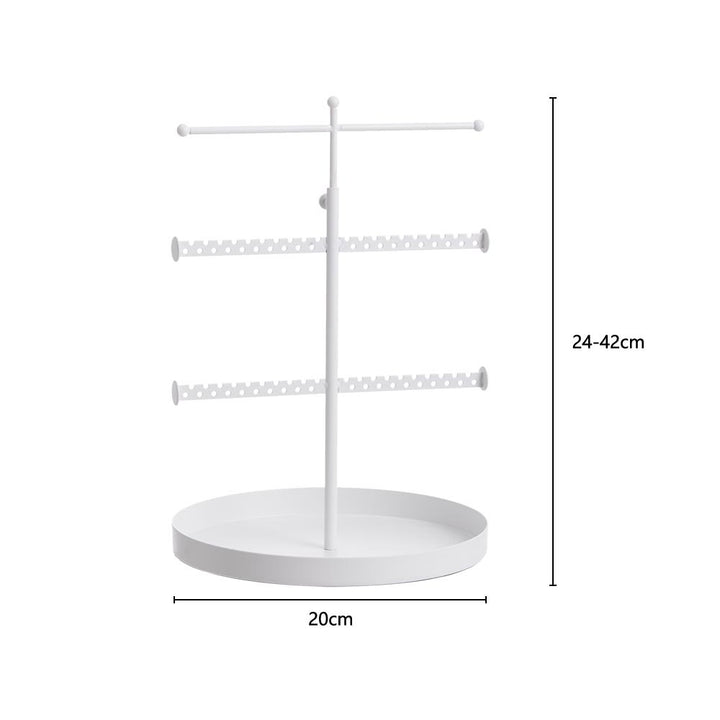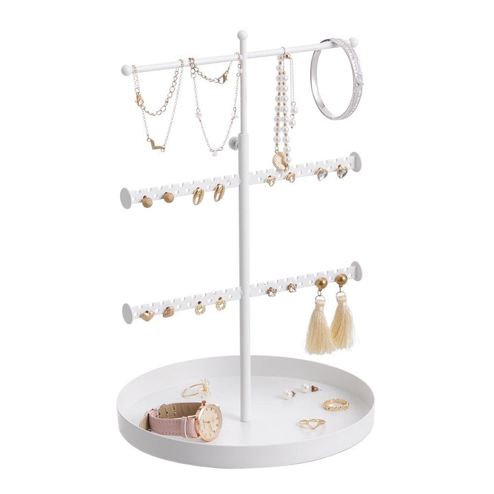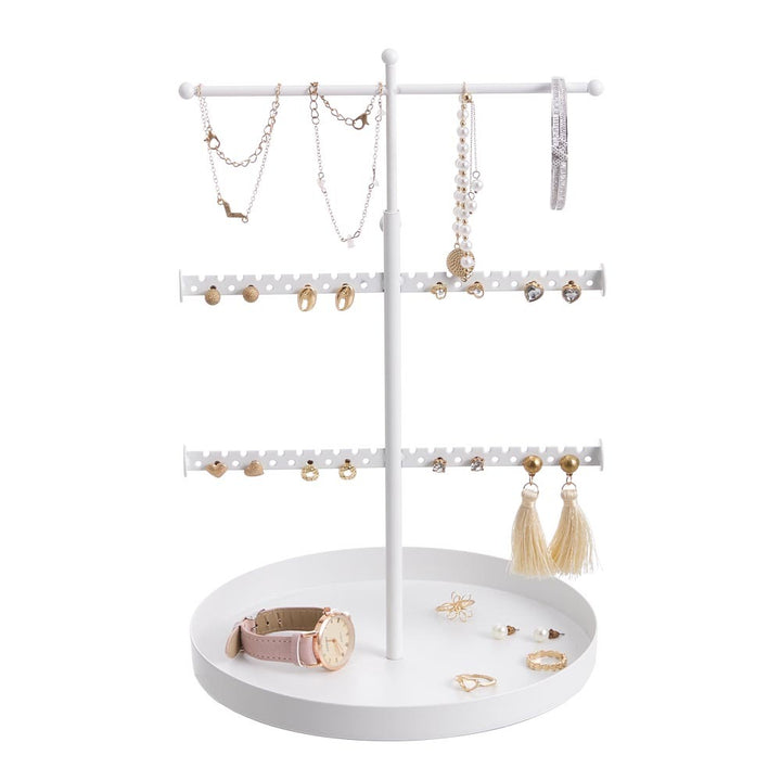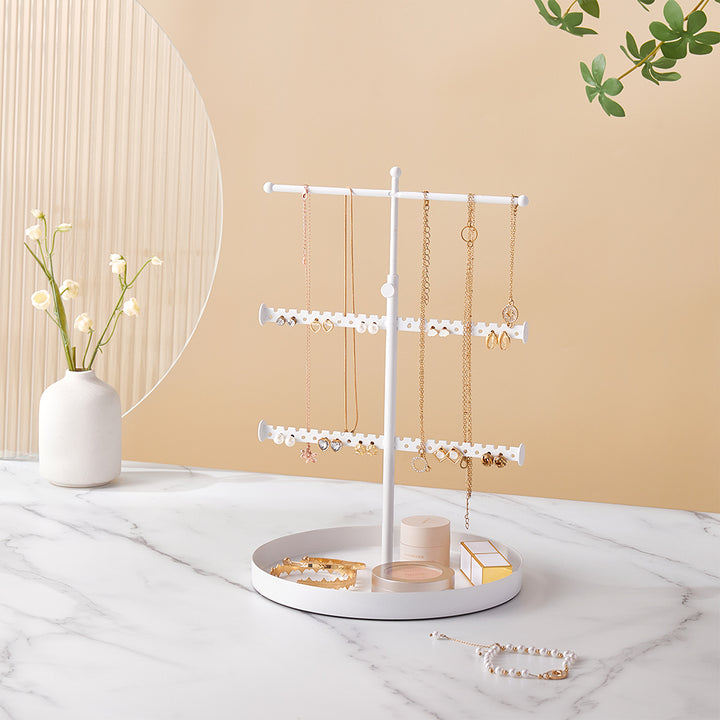 Revolutionize your accessory organization with this versatile jewelry stand. Say goodbye to rummaging through cluttered baskets! Designed to accommodate necklaces, bracelets, watches, and rings, it ensures easy access to your favorite pieces. Its functional yet elegant design guarantees stability, even with longer necklaces or extensive collections. Plus, the bottom tray offers ample space for rings and earrings, enhancing the sophistication of your dressing table.
