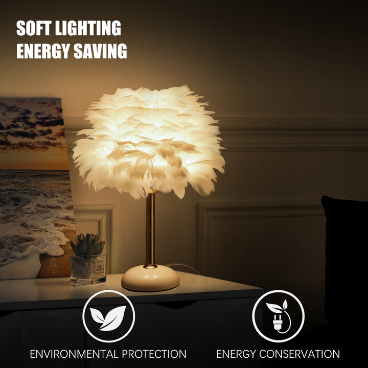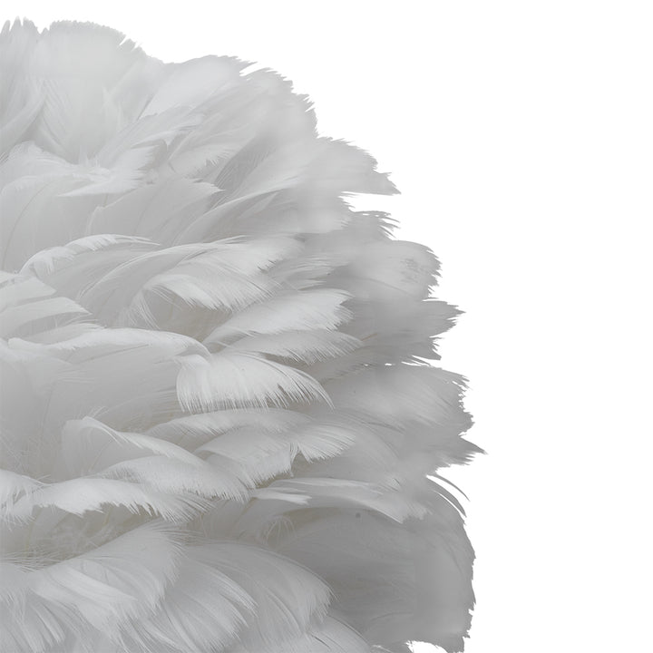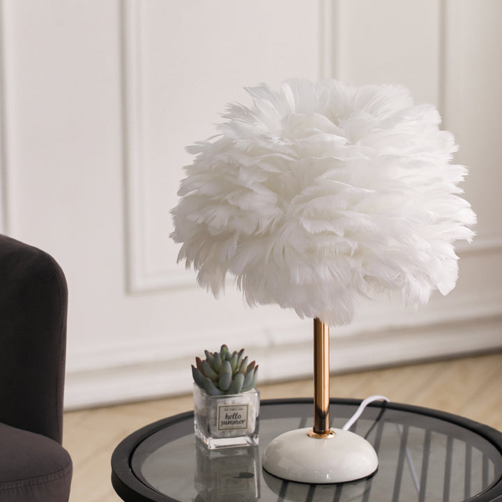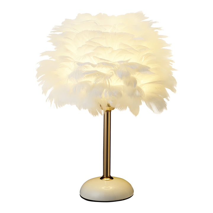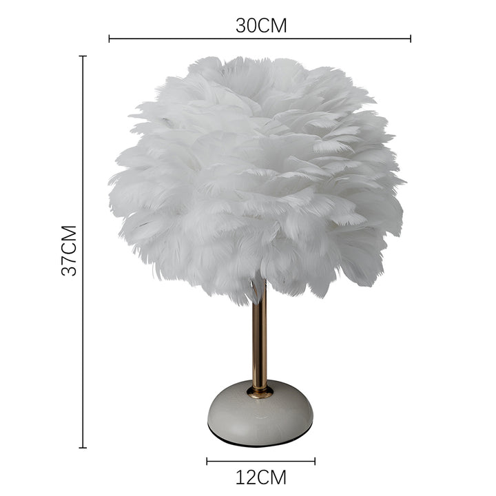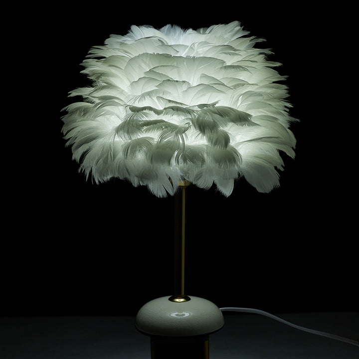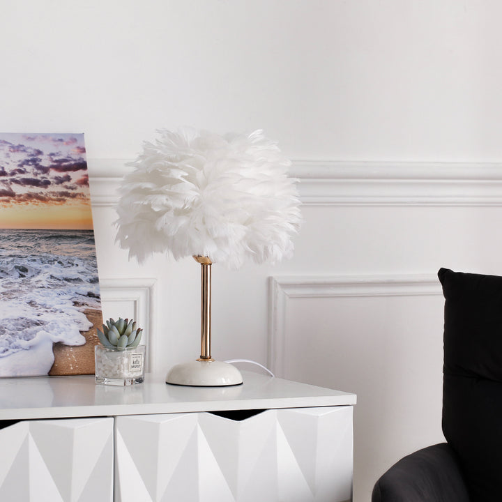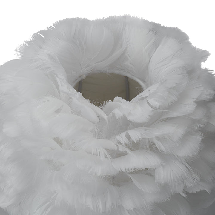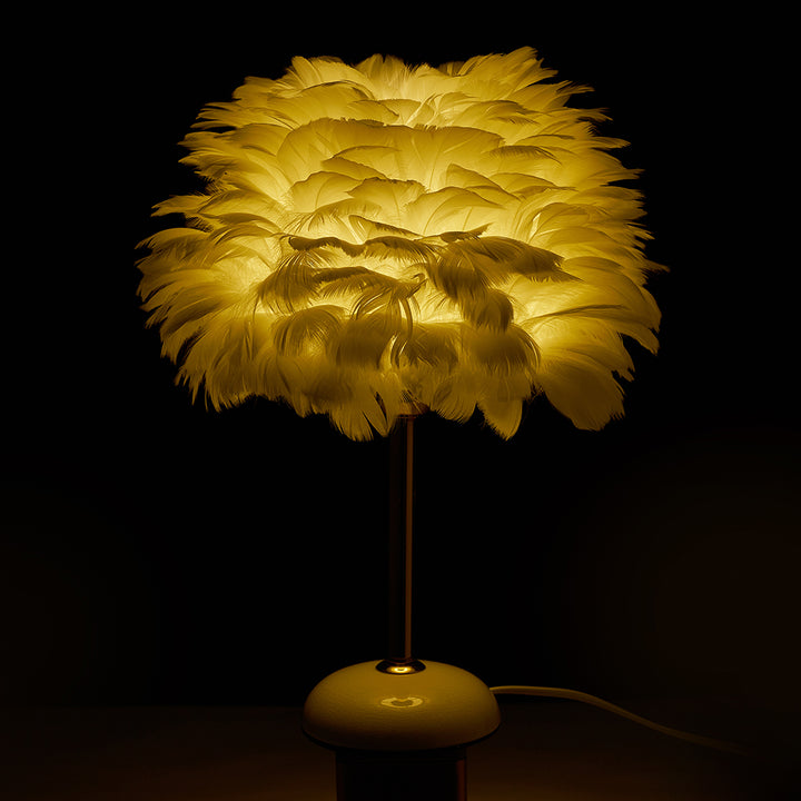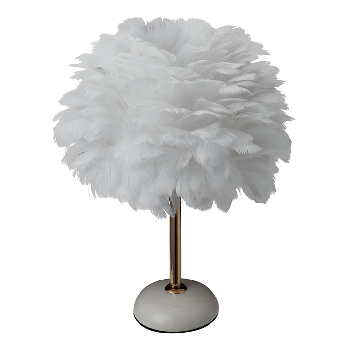 Infuse romance into your space with this enchanting feather lamp. Its lampshade is crafted from natural soft white feathers, adding a lively and intriguing touch to your bedroom. Standing on a ceramic base that is treated with a special crack glaze process, it connects with the brass-coloured metal pillar, creating a distinctive artistic ambience. When illuminated, the captivating play of light and shadow will utterly mesmerize you.