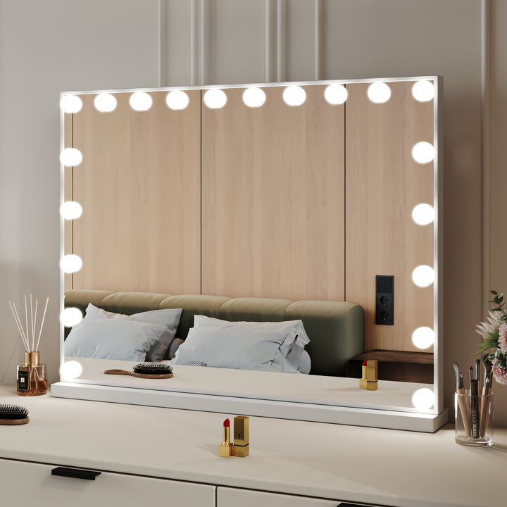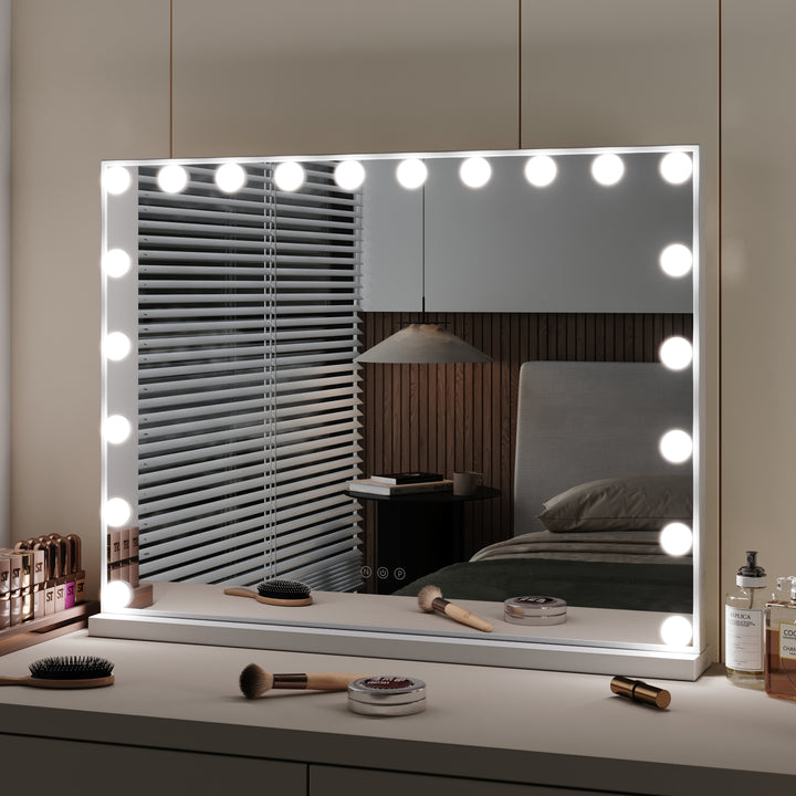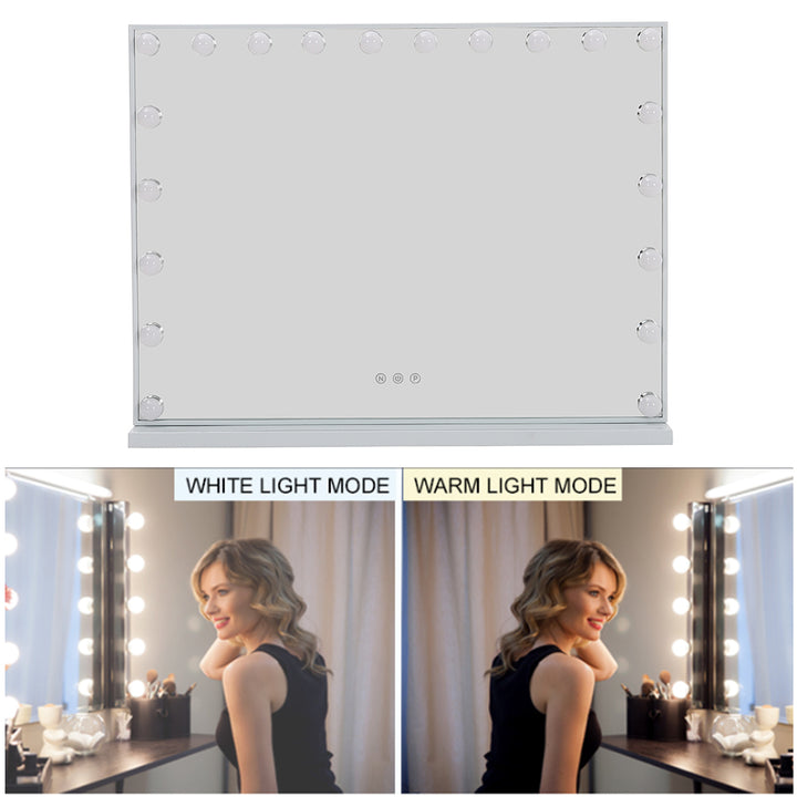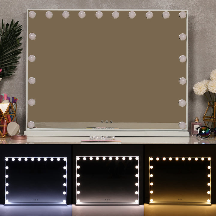 Enhance your daily makeup routine with this elegant Hollywood-style vanity mirror. Its clean lines and sophisticated white finish add a touch of class to any room. The large rectangular design (80cm W x 62.5cm H) provides a clear, spacious reflection, perfect for precise makeup application and styling. With adjustable color temperature and brightness, the LED bulbs emit soft, natural light that is gentle on your eyes, ensuring you always have the perfect lighting for any occasion.