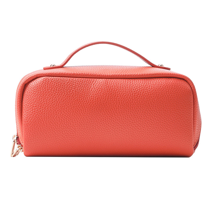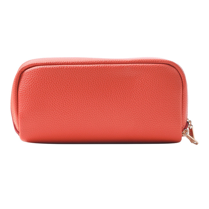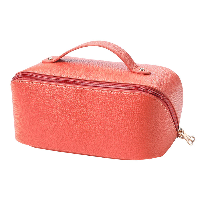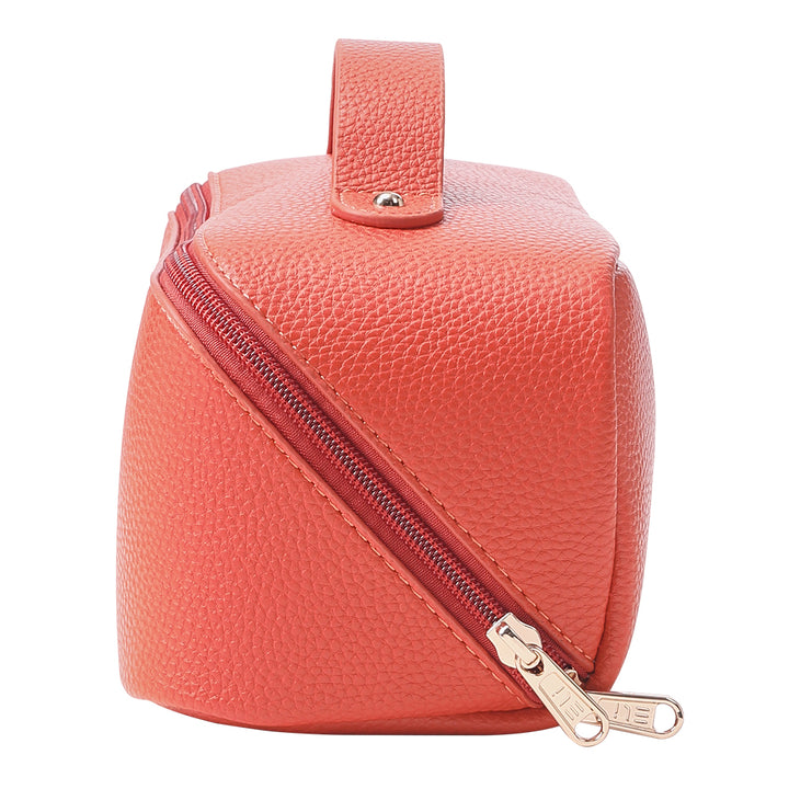 Traveling in style with your makeup essentials has never been easier than with this sophisticated leather makeup bag. Crafted with a luxurious exterior, it's designed to accompany you on your journeys to your favorite destinations. The unique zipper design allows the bag to open wide, unveiling removable pockets that unfold for effortless visibility and access to your cosmetics. This thoughtful design ensures convenient storage and seamless use, making it an ideal companion for your travels. With multiple compartments, organizing your supplies is a breeze, ensuring everything has its place for easy access.