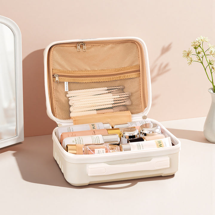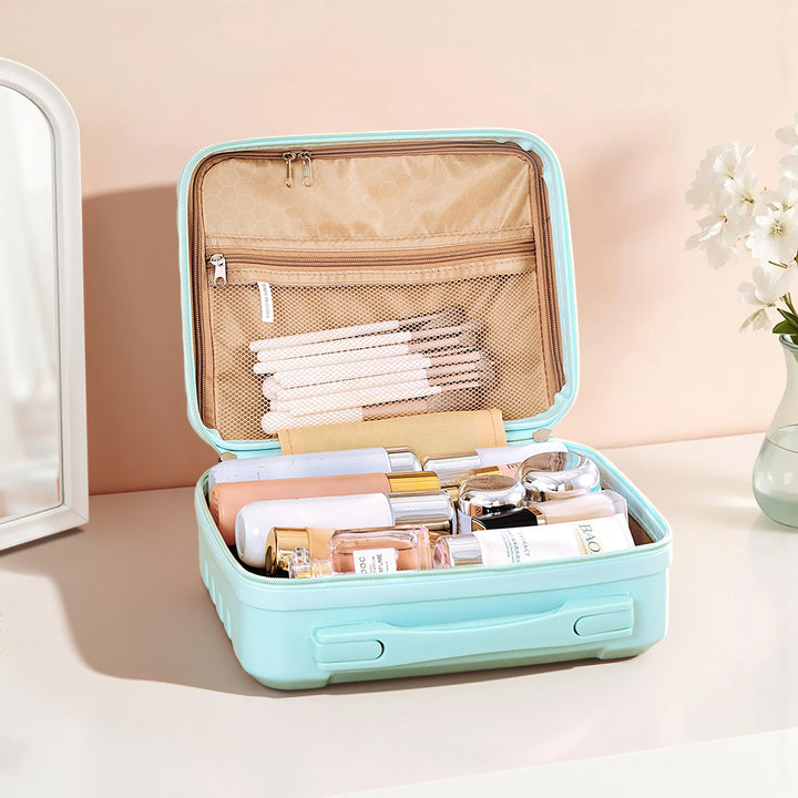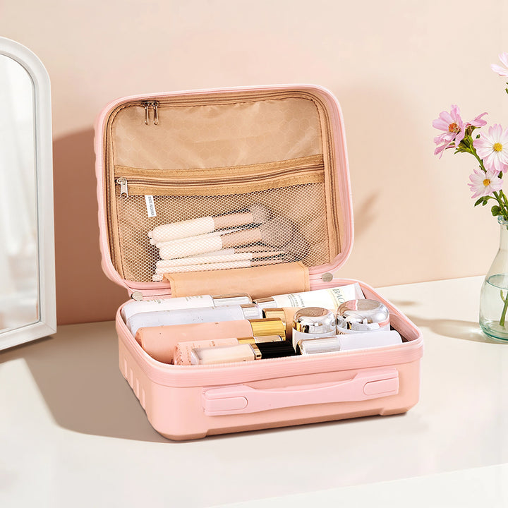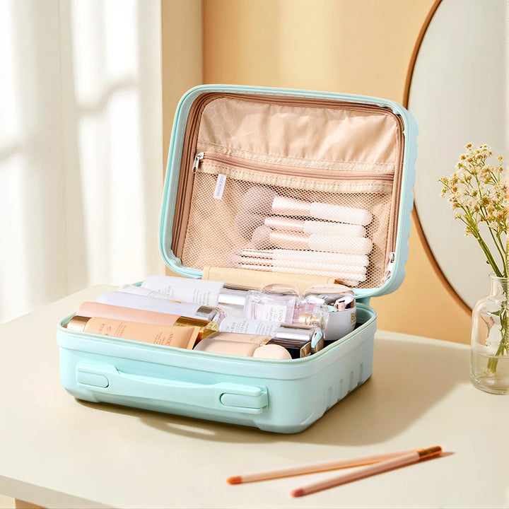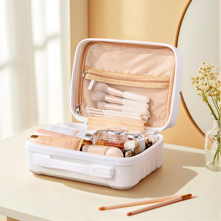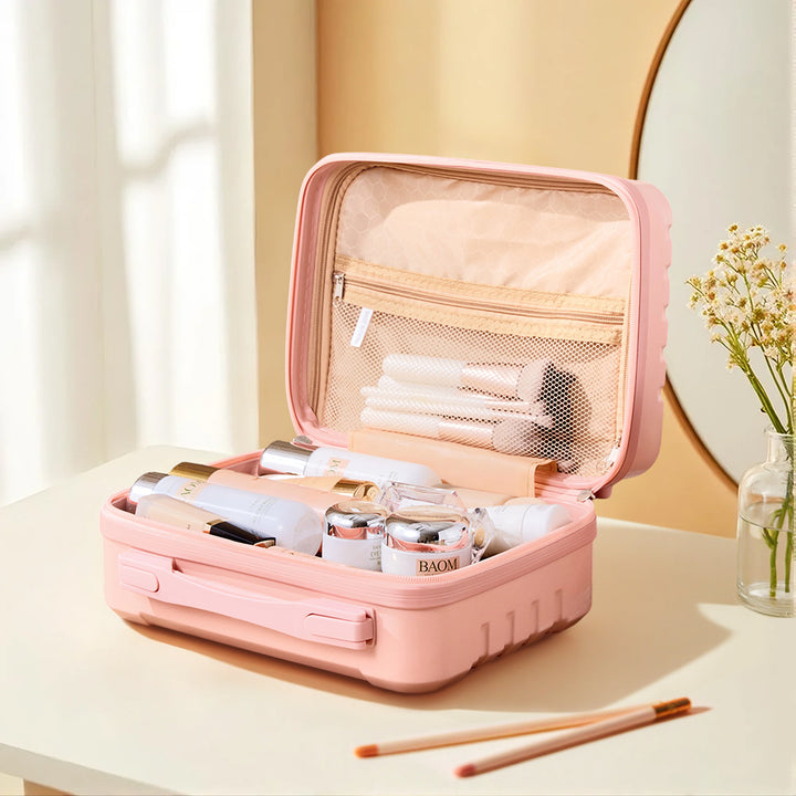 This travel makeup case effortlessly combines style and functionality for the modern traveler. Crafted from waterproof, crush-resistant materials, it offers reliable protection for all your beauty essentials. Its smooth edges add a layer of safety by minimizing impact during bumps or drops. Inside, a spacious, thoughtfully organized interior keeps everything in place—making it easy to find exactly what you need, when you need it. Whether you are organising at home or packing for a getaway, this case keeps your cosmetics secure, tidy, and travel-ready.
